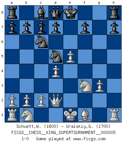Last move : 1-0 2019 April 29 6:49:44 [Event "FICGS__CHESS__KING_SUPERTOURNAMENT__000005"] [Site "FICGS"] [Date "2019.03.01"] [Round "1"] [White "Schuett,Wilhelm"] [Black "Uralskiy,Georgiy"] [Result "1-0"] [WhiteElo "1800"] [BlackElo "1700"] 1.e4 e5 2.f4 exf4 3.Nf3 g5 4.d4 Bg7 5.g3 fxg3 6.Bxg5 Bf6 7.Bxf6 Nxf6 8.e5 Nd5 9.hxg3 Nc6 10.Qd2 1-0 This chess game has been lost on time (started : 2019.03.01 23:14:54) KGA : Rosentreter gambit Player White won this chess game. Follow this game move after move (download)The passion for playing Chess is one of the most unaccountable in the world. (H.G. Wells) Kostenjuk hat keinen Sexappeal. (Loek van Wely) No hay otro maestro que tenga una voluntad terrífica de ganar. Al tablero, el irradía peligro y aún los oponentes mas fuertes tienden a congelarse como liebres cuando olfatean a una pantera. Aún sus debilidades son peligrosas. Con las blancas, su juego de apertura es predecible - te es posible hacer planes en su contra - pero es tan fuerte que tus planes casi nunca funcionan. En el juego medio, su precisión e invención son fabulosas y en finales, tú simplemente no le puedes vencer. (Experto Alemán anónimo) Votre seul travail dans les ouvertures est d'obtenir un milieu de partie jouable. (Lajos Portish) It's not the will to win, but the will to prepare to win that makes the difference. (Bear Bryant)