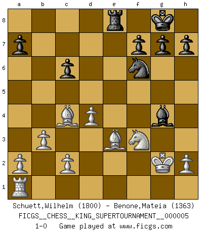 Last move : 1-0 2019 June 23 16:42:24 [Event "FICGS__CHESS__KING_SUPERTOURNAMENT__000005"] [Site "FICGS"] [Date "2019.03.01"] [Round "1"] [White "Schuett,Wilhelm"] [Black "Benone,Mateia"] [Result "1-0"] [WhiteElo "1800"] [BlackElo "1363"] 1.e4 e5 2.f4 d5 3.exd5 exf4 4.Nf3 Nf6 5.Bb5+ c6 6.dxc6 bxc6 7.Bc4 Qe7+ 8.Qe2 Qxe2+ 9.Kxe2 Bd6 10.Re1 O-O 11.Kf1 Bg4 12.Ne5 Bxe5 13.Rxe5 Nbd7 14.Re7 Rae8 15.Rxe8 Rxe8 16.d4 f3 17.Nd2 fxg2+ 18.Kxg2 Nb6 19.b3 Nbd5 20.Nf3 Ne3+ 21.Bxe3 1-0 KGD : Falkbeer counter-gambit Kingside Castling by player Black (move 10) Player White won this chess game. Follow this game move after move (download)It is no time to be playing Chess when the house is on fire. (Italian Proverb) Die Partien sind immer verschieden, die Interviews immer die gleichen. (Garry Kasparov) El hombre es un frívolo, una creatura engañosa y como un jugador de Ajedrez, se preocupa mas por el proceso de obtener su meta que de la meta por sí misma. (Dostoyevsky) Les Echecs, c'est l'art de la guerre sans les charniers, c'est la résurrection des morts tombés au champ d'honneur, l'espoir perpétuel, la suprématie de l'intelligence sur la force, la culture de l'esprit. (F. Szpiner) Perception is reality. (Immanuel Kant)