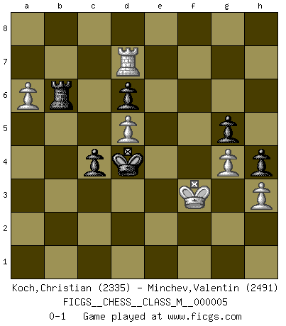 Last move : 0-1 2006 November 28 20:43:26 [Event "FICGS__CHESS__CLASS_M__000005"] [Site "FICGS"] [Date "2006.06.13"] [Round "1"] [White "Koch,Christian"] [Black "Minchev,Valentin"] [Result "0-1"] [WhiteElo "2335"] [BlackElo "2491"] 1.e4 c5 2.Nf3 Nc6 3.Bb5 g6 4.O-O Bg7 5.Re1 e5 6.Nc3 Nge7 7.d3 O-O 8.Bg5 h6 9.Bxe7 Nxe7 10.a4 d6 11.h3 Kh7 12.Bc4 f5 13.Qe2 Rb8 14.Nd5 Nxd5 15.Bxd5 b6 16.Nd2 Bd7 17.exf5 Rxf5 18.Ne4 Qc7 19.f3 Bf8 20.Nc3 Qd8 21.Qd2 Be7 22.Ne4 Qc7 23.Nc3 Bh4 24.Rf1 Rbf8 25.Be4 R5f7 26.Qe2 Qd8 27.Kh2 Qg5 28.Bd5 Rf5 29.Ne4 Qf4+ 30.Kh1 Bg3 31.Nxg3 Qxg3 32.Qf2 Qxf2 33.Rxf2 Rf4 34.a5 b5 35.c3 g5 36.Kh2 Kg6 37.Kg1 h5 38.Be4+ Kg7 39.d4 exd4 40.cxd4 c4 41.g3 R4f7 42.Kg2 Re7 43.Rh1 h4 44.a6 Kh6 45.g4 Rf4 46.Rd2 Be8 47.Ra1 Kg7 48.d5 Kf6 49.Re2 Bg6 50.Ra5 Bxe4 51.Rxe4 R7xe4 52.fxe4 Rxe4 53.Rxb5 Ke5 54.Rb7 Re3 55.Rxa7 Re2+ 56.Kf3 Rxb2 57.Re7+ Kd4 58.Rd7 Rb6 0-1 Sicilian : Nimzovich-Rossolimo attack (with ...g6, without ...d6) Kingside Castling by player White (move 4) Kingside Castling by player Black (move 7) Player Black won this chess game. Follow this game move after move (download)When you absolutely don't know what to do anymore, it is time to panic. (John van der Wiel) Du musst Deinen Gegner in einen tiefen dunklen Wald führen wo 2+2=5 ist und wo der Weg, der wieder hinausführt, nur breit genug für einen ist. (Mikhail Nekhemyevich Tal) Todos los jugadores de Ajedrez deberían tener un pasatiempo. (Savielly Tartakower) Mais l'homme est une créature légère et illogique : semblable au joueur d'échecs, il n'aime que le processus du but à atteindre, non le but lui-même. (Dostoïevsky) Before all elsed, be armed. (Niccolo Machiavelli)