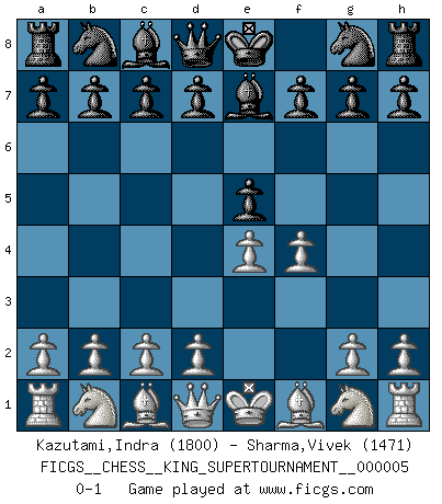 Last move : 0-1 2019 April 1 14:27:52 [Event "FICGS__CHESS__KING_SUPERTOURNAMENT__000005"] [Site "FICGS"] [Date "2019.03.01"] [Round "1"] [White "Kazutami,Indra"] [Black "Sharma,Vivek"] [Result "0-1"] [WhiteElo "1800"] [BlackElo "1471"] 1.e4 e5 2.f4 Be7 0-1 This chess game has been lost on time (started : 2019.03.01 23:14:54) King's gambit Player Black won this chess game. Follow this game move after move (download)I am still a victim of Chess. It has all the beauty of art and much more. It cannot be commercialized. Chess is much purer than art in its social position. (Marcel Duchamp) Es ist nicht das erste mal, dass sich die FIDE dem Arabischen Geld gebeugt hat (über die FIDE WM 2004 in Lybien). (Larry Evans) Cuando no sepas que mover, espera por una idea que se le venga a la la cabeza de tu oponente. Tenlo por seguro de que esa idea estará incorrecta. (Siegbert Tarrasch) Les ravages du H expliquent la différence de niveau entre Tal et Thal [Abergel]. Art disturbs, science reassures. (Georges Braque, Le Jour et la Nuit)