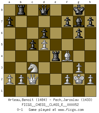 Last move : 0-1 2007 November 21 19:31:16 [Event "FICGS__CHESS__CLASS_E__000052"] [Site "FICGS"] [Date "2007.06.03"] [Round "1"] [White "Arteau,Benoit"] [Black "Pech,Jaroslav"] [Result "0-1"] [WhiteElo "1484"] [BlackElo "1433"] 1.d4 Nf6 2.c4 g6 3.g3 Bg7 4.Bg2 O-O 5.e4 d6 6.Ne2 c5 7.d5 e6 8.Nbc3 exd5 9.cxd5 Re8 10.O-O b5 11.Nxb5 Nxe4 12.Nec3 Nxc3 13.Nxc3 Nd7 14.Bf4 Ne5 15.Re1 Rb8 16.Qc2 Bf5 17.Be4 Nf3+ 18.Kg2 Nxe1+ 19.Rxe1 Bxe4+ 20.Rxe4 Rxe4 0-1 King's Indian : 3.g3 Kingside Castling by player Black (move 4) Kingside Castling by player White (move 10) Player Black won this chess game. Follow this game move after move (download)By playing at Chess then, we may learn: First: Foresight... Second: Circumspection... Third: Caution... And lastly, we learn by Chess the habit of not being discouraged by present bad appearances in the state of our affairs, the habit of hoping for a favorable chance, and that of persevering in the secrets of resources. (Benjamin Franklin) Charakterschwächen offenbaren sich normalerweise während einer Schachpartie. (Garry Kasparov) Las combinaciones han sido siempre el aspecto más intrigante del Ajedrez. Los Maestros las buscan, el público las aplauden, los críticos las alaban. La razón se debe a que las combinaciones hacen posible que el Ajedrez sea más que un ejercicio matemático con una carencia de vida. Ellas son la poesía del juego, son del Ajedrez lo que la melodía es de la música. Ellas representan el triunfo de la mente sobre la materia. (Reuben Fine) Fischer est le meilleur joueur du monde et Karpov n'est qu'un joueur de bistrot. (Garry Kasparov, agé de 16 ans) Real knowledge is to know the extent of one's ignorance. (Confucius)