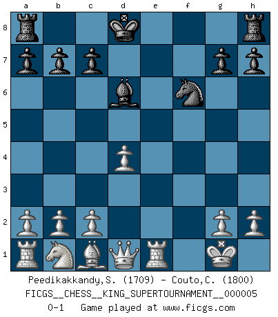 Last move : 0-1 2019 May 24 15:53:23 [Event "FICGS__CHESS__KING_SUPERTOURNAMENT__000005"] [Site "FICGS"] [Date "2019.03.01"] [Round "1"] [White "Peedikakkandy,Sameer"] [Black "Couto,Charles"] [Result "0-1"] [WhiteElo "1709"] [BlackElo "1800"] 1.e4 e5 2.f4 Nc6 3.fxe5 Nxe5 4.d4 Nc4 5.Bxc4 Bd6 6.e5 Be7 7.Nf3 d6 8.exd6 Bxd6 9.O-O Nf6 10.Re1+ Kf8 11.Ng5 Be6 12.Bxe6 fxe6 13.Nxe6+ Ke8 14.Nxd8 Kxd8 0-1 King's gambit Kingside Castling by player White (move 9) Player Black won this chess game. Follow this game move after move (download)Chess problems demand from the composer the same virtues that characterize all worthwhile art: originality, invention, conciseness, harmony, complexity, and splendid insincerity. (Vladimir Nabokov) Fallen sollten polizeilich verboten werden. (Savielly Grigorievitsch Tartakower) El Ajedrez es un mar en el cual un mosquito puede beber y un elefante puede bañarse. (Refrán Hindú) Le thème de l'attaque double intervient d'une manière ou d'une autre dans l'immense majorité des combinaisons. (Youri Averbakh) It's not a bug - it's an undocumented feature. (Anonymous)