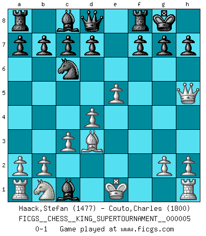 Last move : 0-1 2019 May 14 20:40:24 [Event "FICGS__CHESS__KING_SUPERTOURNAMENT__000005"] [Site "FICGS"] [Date "2019.03.01"] [Round "1"] [White "Haack,Stefan"] [Black "Couto,Charles"] [Result "0-1"] [WhiteElo "1477"] [BlackElo "1800"] 1.e4 e5 2.f4 Nc6 3.Nf3 Nf6 4.fxe5 Nxe4 5.d4 Be7 6.Bd3 Ng5 7.c3 O-O 8.Nxg5 Bxg5 9.Qh5 Bxc1 0-1 This chess game has been lost on time (started : 2019.03.01 23:14:54) King's gambit Kingside Castling by player Black (move 7) Player Black won this chess game. Follow this game move after move (download)Fischer is completely natural. He plays no roles. He's like a child. Very, very simple. (Zita Rajcsanyi) Heutzutage gewinnt im Turnier nicht derjenige Spieler, der weitreichende Pläne entwirft, sondern einfach jener, der Zug um Zug kämpft. (David Bronstein) La última cosa en que Fischer estaba interesado era en tonterías, siempre y cuando el Ajedrez estuviera involucrado. (Elie Agur) J'ai toujours senti une vague pitié pour l'homme qui ne connaît rien aux échecs, tout comme j'en aurais pour un homme ignorant de l'amour. Les Echecs, comme la musique ou comme l'amour, ont le pouvoir de rendre heureux. (Siegbert Tarrasch) As the days dwindle down... to a precious few. (Maxwell Anderson)