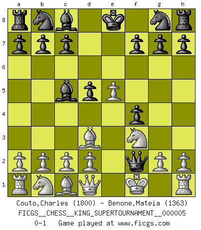 Last move : 0-1 2019 April 23 10:45:20 [Event "FICGS__CHESS__KING_SUPERTOURNAMENT__000005"] [Site "FICGS"] [Date "2019.03.01"] [Round "1"] [White "Couto,Charles"] [Black "Benone,Mateia"] [Result "0-1"] [WhiteElo "1800"] [BlackElo "1363"] 1.e4 e5 2.f4 d5 3.Bd3 exf4 4.e5 Qh4+ 5.Kf1 Bc5 6.Nf3 Qf2+ 0-1 KGD : Falkbeer counter-gambit Player Black won this chess game. Follow this game move after move (download)Up to this point White has been following well-known analysis. But now he makes a fatal error: he begins to use his own head. (Siegbert Tarrasch) Wenn ein Kopf und ein Buch zusammenstoßen und es klingt hohl, ist es denn allemal im Buche? (Georg Christoph Lichtenberg) El Ajedrez es tan inspirador que yo no creo que un buen jugador sea capaz de tener un pensamiento malo durante una partida. (Wilhelm Steinitz) Toutes choses étant égales, c'est la conviction qui gagne. Alliée à une volonté de vaincre, elle sert de détonateur, suscite des idées, disperse les doutes et aide à penser clairement. (Robert Fischer) The Internet is the first thing that humanity has build that humanity doesn't understand, the largest experiment in anarchy that we have ever had. (Eric Schmidt)