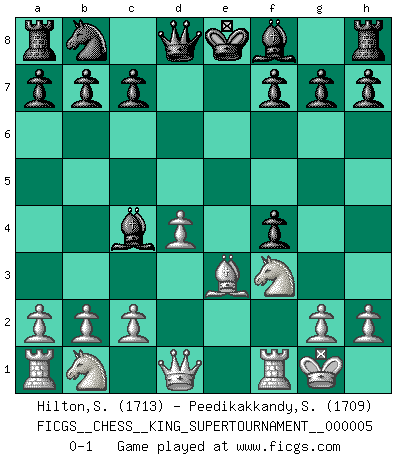 Last move : 0-1 2019 March 15 17:36:47 [Event "FICGS__CHESS__KING_SUPERTOURNAMENT__000005"] [Site "FICGS"] [Date "2019.03.01"] [Round "1"] [White "Hilton,Stephen"] [Black "Peedikakkandy,Sameer"] [Result "0-1"] [WhiteElo "1713"] [BlackElo "1709"] 1.e4 e5 2.f4 d5 3.exd5 exf4 4.Nf3 Nf6 5.d4 Nxd5 6.Bc4 Be6 7.O-O Ne3 8.Bxe3 Bxc4 0-1 KGD : Falkbeer counter-gambit Kingside Castling by player White (move 7) Player Black won this chess game. Follow this game move after move (download)Could we look into the head of a Chess player, we should see there a whole world of feelings, images, ideas, emotion and passion. (Alfred Binet) Der zweitbeste Zug ist oft der einzig richtige. (Savielly Grigorievitsch Tartakower) Una compensación adecuada por un sacrificio es tener una combinación sólida que conduce a una posición ganadora; una compensación adecuada por una metida de pata es dejar a tu oponente arrebatar una derrota de las fauces de la victoria. (Bruce A. Moon) La victoire dans une partie d'Echecs appartient la plupart du temps à celui qui voit un peu plus loin que l'adversaire. (Lasker) Go and wake up your luck. (Persian saying)