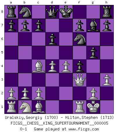 Last move : 0-1 2019 April 8 3:43:18 [Event "FICGS__CHESS__KING_SUPERTOURNAMENT__000005"] [Site "FICGS"] [Date "2019.03.01"] [Round "1"] [White "Uralskiy,Georgiy"] [Black "Hilton,Stephen"] [Result "0-1"] [WhiteElo "1700"] [BlackElo "1713"] 1.e4 e5 2.f4 exf4 3.Nf3 d6 4.d4 g5 5.Bc4 Bg7 6.O-O Bg4 7.h3 Bxf3 8.Qxf3 Nf6 0-1 This chess game has been lost on time (started : 2019.03.01 23:14:54) KGA : Fischer defense Kingside Castling by player White (move 6) Player Black won this chess game. Follow this game move after move (download)Chess is a matter of delicate judgment, knowing when to punch and how to duck. (Bobby Fischer) Nie in meinem Leben habe ich die französische Verteidigung gespielt, welche die Stumpfsinnigste von allen ist. (Wilhelm Steinitz) Evita las multitudes. Haz independientemente tu propio razonamiento. Trata de ser el jugador de Ajedrez, no la pieza de Ajedrez. (Ralph Charell) Je menace de comprendre la position. (Anonyme) In every real man a child is hidden that wants to play. (Friedrich Nietzsche)