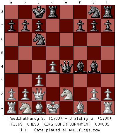 Last move : 1-0 2019 May 7 7:29:48 [Event "FICGS__CHESS__KING_SUPERTOURNAMENT__000005"] [Site "FICGS"] [Date "2019.03.01"] [Round "1"] [White "Peedikakkandy,Sameer"] [Black "Uralskiy,Georgiy"] [Result "1-0"] [WhiteElo "1709"] [BlackElo "1700"] 1.e4 e5 2.f4 Nc6 3.fxe5 d6 4.exd6 Bxd6 5.d4 Qh4+ 6.Kd2 Qxe4 7.Ne2 Bg4 8.c3 O-O-O 9.Qc2 Bf4+ 10.Kd1 1-0 This chess game has been lost on time (started : 2019.03.01 23:14:54) King's gambit Queenside Castling by player Black (move 8) Player White won this chess game. Follow this game move after move (download)Bobby is the most misunderstood, misquoted celebrity walking the face of this earth. (Yasser Seirawan) Fischer: 'Remis!?' Uhlmann: 'Aber es muss doch dreimal Zugwiederholung sein!' Fischer: 'Sie nehmen das Remis an, wie ich es sage, sonst spiele ich weiter und werde Sie dann schlagen!' (Robert James Fischer) El muchacho (en ese entonces un niño de 12 años llamado Anatoly Karpov) no tiene ni idea de lo que es el Ajedrez y no hay futuro en absoluto para el en esta profesión. (Mikhail Botvinnik) Les réformistes prétendent que les progrès de la théorie conduiront à la disparition des échecs, et qu'il faut, pour leur rendre vie, en remanier les règles. En réalité, qu'exprime cette affirmation? Le mépris de l'intuition, de l'imagination et de tous les autres éléments qui font des échecs un art. (Alexander Alekhine) I find television to be very educating. Every time somebody turns on the set, I go in the other room and read a book. (Groucho Marx)