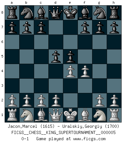 Last move : 0-1 2019 April 4 3:3:16 [Event "FICGS__CHESS__KING_SUPERTOURNAMENT__000005"] [Site "FICGS"] [Date "2019.03.01"] [Round "1"] [White "Jacon,Marcel"] [Black "Uralskiy,Georgiy"] [Result "0-1"] [WhiteElo "1615"] [BlackElo "1700"] 1.e4 e5 2.f4 d5 0-1 This chess game has been lost on time (started : 2019.03.01 23:14:54) KGD : Falkbeer counter-gambit Player Black won this chess game. Follow this game move after move (download)Your body has to be in top condition. Your Chess deteriorates as your body does. You can't separate body from mind. (Bobby Fischer) Ich kenne Menschen, die allen Willen der Welt besitzen und doch nicht Schach spielen können. (Robert James Fischer) Yo adoro todas la posiciones. Denme una partida posicional difícil, y la jugaré. Pero posiciones totalmente ganadas, no las tolero. (Hein Donner) Votre prénom est 'Tactique', votre deuxième prénom est 'Tactique' et votre nom est 'Tactique'. (Ken Smith) I find your interest interesting. (Gregory House, House M.D.)