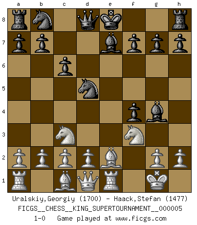 Last move : 1-0 2019 May 11 20:20:6 [Event "FICGS__CHESS__KING_SUPERTOURNAMENT__000005"] [Site "FICGS"] [Date "2019.03.01"] [Round "1"] [White "Uralskiy,Georgiy"] [Black "Haack,Stefan"] [Result "1-0"] [WhiteElo "1700"] [BlackElo "1477"] 1.e4 e5 2.f4 exf4 3.Nf3 d5 4.exd5 Nf6 5.Bd3 Bg4 6.O-O Nxd5 7.Nc3 c6 8.Re1+ Be7 9.Be2 1-0 This chess game has been lost on time (started : 2019.03.01 23:14:54) KGA : Abbazia defense, Modern variation Kingside Castling by player White (move 6) Player White won this chess game. Follow this game move after move (download)There's never before been a Chess player with such a thorough knowledge of the intricacies of the game and such an absolutely indomitable will to win. I think Bobby is the greatest player that ever lived. (Lisa Lane) Im Fernschach kannst du während dem Spiel rauchen. (John Christen Knudsen) La única cosa que los jugadores de Ajedrez tienen en común, es el Ajedrez. (Lodewijk Prins) Si le désir cupide (et stupide) de gagner est une inépuisable source de souffrance, une combinaison brillante sur l'échiquier est une découverte : le coquelicot qui s'épanouit lorsque apparaît la Voie Lactée. (Arrabal) Big Chess is a place for big hallucinations. (Thibault de Vassal)
