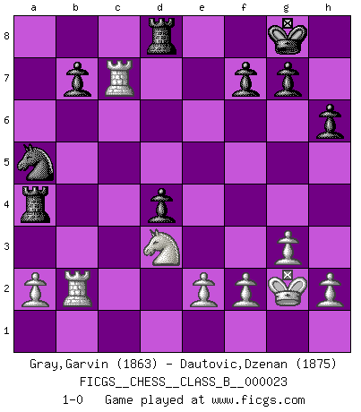 Last move : 1-0 2007 December 30 10:8:47 [Event "FICGS__CHESS__CLASS_B__000023"] [Site "FICGS"] [Date "2007.06.05"] [Round "1"] [White "Gray,Garvin"] [Black "Dautovic,Dzenan"] [Result "1-0"] [WhiteElo "1863"] [BlackElo "1875"] 1.d4 d5 2.c4 e6 3.Nf3 c5 4.cxd5 exd5 5.g3 Nc6 6.Bg2 Nf6 7.O-O Be7 8.Nc3 O-O 9.dxc5 Bxc5 10.Bg5 d4 11.Bxf6 Qxf6 12.Ne4 Qe7 13.Nxc5 Qxc5 14.Rc1 Qb6 15.Qd2 Be6 16.b3 h6 17.Ne1 Rfd8 18.Nd3 a5 19.Rc2 Bd5 20.Rfc1 Bxg2 21.Kxg2 a4 22.bxa4 Rxa4 23.Rb2 Qa5 24.Qxa5 Nxa5 25.Rc7 1-0 Queen's gambit declined Kingside Castling by player White (move 7) Kingside Castling by player Black (move 8) Player White won this chess game. Follow this game move after move (download)What would Chess be without silly mistakes ? (Kurt Richter) Ich brauche nur einen Blick auf das Schachbrett zu werfen, und weiß schon, was in der Stellung steckt, was geschehen kann und was geschehen wird. Alle übrigen suchen und prüfen, ich aber weiß es! (José Raúl Capablanca) En manos de Fischer's, una diminuta ventaja teórica es tan buena como tener una Reina de ventaja. (Isaac Kashdan) Les pièces de l'échiquier étaient impitoyables. Elles le retenaient, elles l'absorbaient. Il y avait de l'horreur en cela, mais aussi une harmonie unique. Car, qu'y a-t-il dans le monde, à part les échecs ? (V. Nabokov) The weakness of an artist is dogma. (Josh Waitzkin)