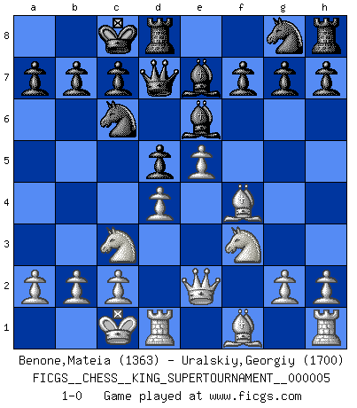 Last move : 1-0 2019 May 13 8:28:14 [Event "FICGS__CHESS__KING_SUPERTOURNAMENT__000005"] [Site "FICGS"] [Date "2019.03.01"] [Round "1"] [White "Benone,Mateia"] [Black "Uralskiy,Georgiy"] [Result "1-0"] [WhiteElo "1363"] [BlackElo "1700"] 1.e4 e5 2.f4 Be7 3.Nf3 exf4 4.Qe2 Nc6 5.d4 d5 6.e5 Be6 7.Bxf4 Qd7 8.Nc3 O-O-O 9.O-O-O 1-0 This chess game has been lost on time (started : 2019.03.01 23:14:54) King's gambit Queenside Castling by player Black (move 8) Queenside Castling by player White (move 9) Player White won this chess game. Follow this game move after move (download)What is the difference between chess and football? Everybody understands football, but nobody plays it. Everybody plays chess, but nobody understands it. Everything is relative. (Vladimir Kramnik) Weshalb minderdergeübte Spieler mit g2-g4 beginnen? Die betreffenden sind unschlüssig, ob sie nun rechts (h4) oder links (f4) beginnen sollen, und in ihrer Ratlosigkeit entschliessen sie sich nach guter Bürgerart dazu, den goldenen Mittelweg zu wählen. (Aaron Nimzowitsch) Del Ajedrez se ha dicho que la vida no es lo suficientemente larga para él, pero eso es culpa de la vida, no del Ajedrez. (William Ewart Napier) Aidez vos pièces, elles vous aideront. (Paul Morphy) All maxims have their antagonist maxims; proverbs should be sold in pairs, a single one being but a half truth. (William Mathews)