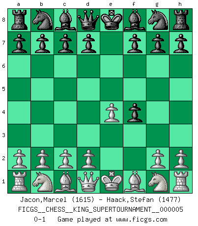 Last move : 0-1 2019 April 9 3:44:11 [Event "FICGS__CHESS__KING_SUPERTOURNAMENT__000005"] [Site "FICGS"] [Date "2019.03.01"] [Round "1"] [White "Jacon,Marcel"] [Black "Haack,Stefan"] [Result "0-1"] [WhiteElo "1615"] [BlackElo "1477"] 1.e4 e5 2.f4 exf4 0-1 This chess game has been lost on time (started : 2019.03.01 23:14:54) King's gambit accepted Player Black won this chess game. Follow this game move after move (download)Via the squares on the chessboard, the Indians explain the movement of time and the age, the higher influences which control the world and the ties which link Chess with the human soul. (Al-Masudi) Ein Teil des Fehlers ist immer korrekt. (Savielly Grigorievitsch Tartakower) El Ajedrez moderno está demasiado preocupado con cosas como la estructura de Peones. Olvidenlo, el Jaque Mate termina la partida. (Nigel Short) Donnez-moi un Cavalier en 6e et je gagnerais toutes mes parties. (Steinitz) It is not titles that honor men, but men that honor titles. (Niccolo Machiavelli)
