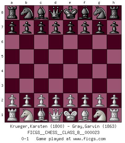 Last move : 0-1 2007 July 15 17:3:32 [Event "FICGS__CHESS__CLASS_B__000023"] [Site "FICGS"] [Date "2007.06.05"] [Round "1"] [White "Krueger,Karsten"] [Black "Gray,Garvin"] [Result "0-1"] [WhiteElo "1800"] [BlackElo "1863"] 0-1 This chess game has been lost on time (started : 2007.06.05 13:18:21) Player Black won this chess game. Follow this game move after move (download)All Chess players should have a hobby. (Savielly Tartakower) Wenn Du einsam bist, wenn Du Dich in der Welt wie ein Fremder fühlst, spiele Schach. Das wird Deinen Geist erheben und Dein Ratgeber im Kampf sein. (Aristoteles) ¿Porque tengo que perder ante este idiota?. (Aron Nimzovich) Le thème de l'attaque double intervient d'une manière ou d'une autre dans l'immense majorité des combinaisons. (Youri Averbakh) The real danger is not that computers will begin to think like men, but that men will begin to think like computers. (Sydney J. Harris)