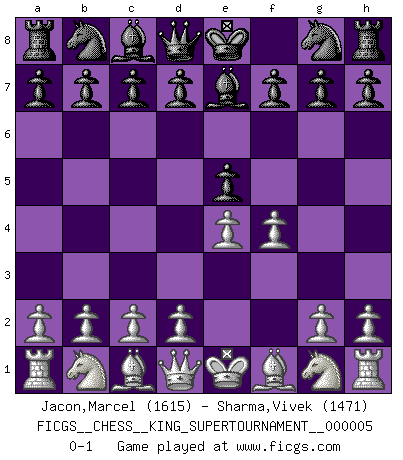 Last move : 0-1 2019 April 1 14:27:52 [Event "FICGS__CHESS__KING_SUPERTOURNAMENT__000005"] [Site "FICGS"] [Date "2019.03.01"] [Round "1"] [White "Jacon,Marcel"] [Black "Sharma,Vivek"] [Result "0-1"] [WhiteElo "1615"] [BlackElo "1471"] 1.e4 e5 2.f4 Be7 0-1 This chess game has been lost on time (started : 2019.03.01 23:14:54) King's gambit Player Black won this chess game. Follow this game move after move (download)It is the aim of the modern school, not to treat every position according to one general law, but according to the principle inherent in the position. (Richard Reti) Im Leben werden Partien nie so unstrittig gewonnen wie im Spiel (Emanuel Lasker) El Ajedrez es un terrible juego. Si no controlas el centro, tu oponente tiene una posición mas holgada. Si tienes control del centro, ¡entonces realmente tu tienes algo de que preocuparte!. (Siegbert Tarrasch) L'ordinateur a tué l'originalité. Il n'y a plus guère d'aventures sur l'échiquier. (Jacob Murray) If everyone is thinking alike, then somebody isn't thinking. (US General George S. Patton)