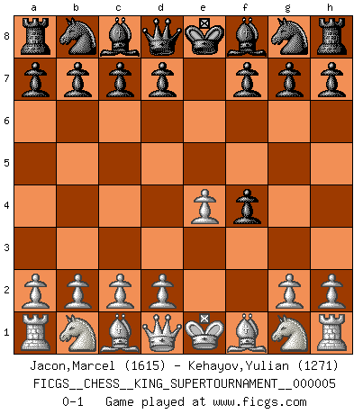 Last move : 0-1 2019 April 5 15:25:10 [Event "FICGS__CHESS__KING_SUPERTOURNAMENT__000005"] [Site "FICGS"] [Date "2019.03.01"] [Round "1"] [White "Jacon,Marcel"] [Black "Kehayov,Yulian"] [Result "0-1"] [WhiteElo "1615"] [BlackElo "1271"] 1.e4 e5 2.f4 exf4 0-1 This chess game has been lost on time (started : 2019.03.01 23:14:54) King's gambit accepted Player Black won this chess game. Follow this game move after move (download)Fischer is the strongest player in the world. In fact, the strongest player who ever lived. (Larry Evans) Wie bekannt hörte Morphy 1859 auf, Schach zu spielen. Seine Enttäuschung galt nicht so sehr dem Schach, wie den Schachspielern. (Robert James Fischer) Bobby solo arroja las piezas y solas caen en las casillas correctas. (Miguel Najdorf ) 'L'échange des dames est un coup dur pour les deux adversaires...' Un journaliste lors d'une partie du match Spassky-Fischer It's not the size of the dog in the fight, it's the size of the fight in the dog. (Mark Twain)