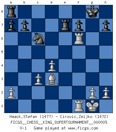 Last move : 0-1 2019 April 28 6:46:30 [Event "FICGS__CHESS__KING_SUPERTOURNAMENT__000005"] [Site "FICGS"] [Date "2019.03.01"] [Round "1"] [White "Haack,Stefan"] [Black "Cirovic,Zeljko"] [Result "0-1"] [WhiteElo "1477"] [BlackElo "1472"] 1.e4 e5 2.f4 exf4 3.Nf3 d5 4.exd5 c6 5.c4 cxd5 6.d4 Bg4 7.Bxf4 Bxf3 8.Qxf3 Bb4+ 9.Nc3 Bxc3+ 10.bxc3 Nf6 11.Bd3 O-O 12.O-O dxc4 13.Bxc4 Nc6 14.Bg5 Na5 15.Bd3 Nc6 16.Bxf6 Qxf6 17.Qxf6 gxf6 18.Rxf6 Rfe8 19.Raf1 Re7 0-1 This chess game has been lost on time (started : 2019.03.01 23:14:54) KGA : Abbazia defense (Classical defense, Modern defense!) Kingside Castling by player Black (move 11) Kingside Castling by player White (move 12) Player Black won this chess game. Follow this game move after move (download)The mistakes are there, waiting to be made. (Savielly Tartakower) Der beste Spieler in einem Turnier gewinnt es nie. Er landet auf Platz zwei oder drei. (Siegbert Tarrasch) Buenas posiciones no logran ganar juegos, buenas movidas sí. (Gerald Abrahams) On entre au jeu d'Echecs comme on entre en Religion. Pour le joueur d'Echecs, la partie d'Echecs c'est l'office, la messe, le défilé du 1er Mai, le dépôt de gerbe au Monument aux Morts. C'est un drame sacré. (Michel Roos) If we knew what we were doing, we would not call it research. (Albert Einstein)
