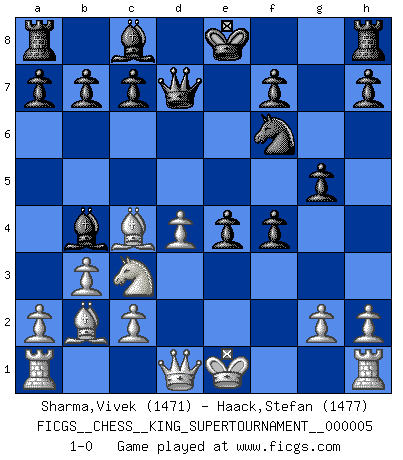 Last move : 1-0 2019 May 4 19:19:23 [Event "FICGS__CHESS__KING_SUPERTOURNAMENT__000005"] [Site "FICGS"] [Date "2019.03.01"] [Round "1"] [White "Sharma,Vivek"] [Black "Haack,Stefan"] [Result "1-0"] [WhiteElo "1471"] [BlackElo "1477"] 1.e4 e5 2.f4 exf4 3.Nf3 d5 4.Nc3 Nf6 5.d4 dxe4 6.Ne5 g5 7.b3 Bb4 8.Bb2 Nbd7 9.Nxd7 Qxd7 10.Bc4 1-0 This chess game has been lost on time (started : 2019.03.01 23:14:54) KGA : Abbazia defense (Classical defense, Modern defense!) Player White won this chess game. Follow this game move after move (download)We cannot resist the fascination of sacrifice, since a passion for sacrifices is part of a Chessplayer's nature. (Rudolf Spielman) Kritik überlasse ich den Spießern. Ich zeige nichts, wofür ich mich schämen muss. (Alexandra Kosteniuk) El Peón aislado arroja penumbra sobre todo el tablero. (Aaron Nimzovich) Toute estimation doit être constamment réévaluée. (Jacob Estrin) For peace of mind, resign as general manager of the universe. (Douglas Adams)
