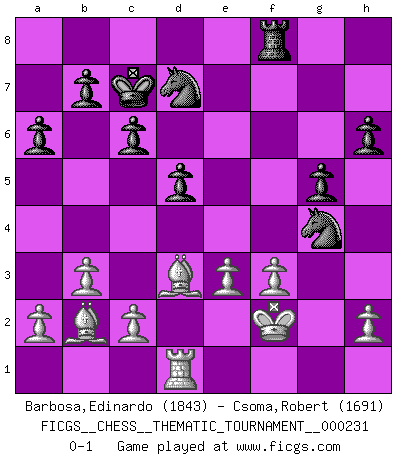 Last move : 0-1 2019 March 25 17:8:42 [Event "FICGS__CHESS__THEMATIC_TOURNAMENT__000231"] [Site "FICGS"] [Date "2019.03.02"] [Round "1"] [White "Barbosa,Edinardo"] [Black "Csoma,Robert"] [Result "0-1"] [WhiteElo "1843"] [BlackElo "1691"] 1.e4 e5 2.Nf3 Nf6 3.Nxe5 d6 4.Nd3 Nxe4 5.Qe2 Qe7 6.b3 Bf5 7.Bb2 Nd7 8.f3 Nef6 9.Qxe7+ Bxe7 10.Nc3 O-O-O 11.O-O-O d5 12.g4 Be6 13.Nf4 Bd6 14.Nxe6 fxe6 15.Nb5 Bc5 16.Re1 a6 17.Nd4 e5 18.Ne6 Rdg8 19.Nxc5 Nxc5 20.Rxe5 Ncd7 21.Re3 Re8 22.Bh3 Rxe3 23.dxe3 Re8 24.Kd2 h6 25.Ke2 g5 26.Rd1 c6 27.Kf2 Kc7 28.Bf1 Rf8 29.Bd3 Nxg4+ 0-1 Petrov's defense Queenside Castling by player Black (move 10) Queenside Castling by player White (move 11) Player Black won this chess game. Follow this game move after move (download)By playing at Chess then, we may learn: First: Foresight... Second: Circumspection... Third: Caution... And lastly, we learn by Chess the habit of not being discouraged by present bad appearances in the state of our affairs, the habit of hoping for a favorable chance, and that of persevering in the secrets of resources. (Benjamin Franklin) Es ist besser die Steine des Gegners zu opfern. (Savielly Grigorievitsch Tartakower) Dejen al perfeccionista jugar por correo. (Yasser Seirawan) Fischer est le meilleur joueur du monde et Karpov n'est qu'un joueur de bistrot. (Garry Kasparov, agé de 16 ans) I find television to be very educating. Every time somebody turns on the set, I go in the other room and read a book. (Groucho Marx)
