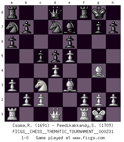 Last move : 1-0 2019 May 28 10:15:24 [Event "FICGS__CHESS__THEMATIC_TOURNAMENT__000231"] [Site "FICGS"] [Date "2019.03.02"] [Round "1"] [White "Csoma,Robert"] [Black "Peedikakkandy,Sameer"] [Result "1-0"] [WhiteElo "1691"] [BlackElo "1709"] 1.e4 e5 2.Nf3 Nf6 3.Nxe5 d6 4.Nd3 Be7 5.Nc3 Nc6 6.Be2 O-O 7.O-O Be6 8.Nf4 a6 9.d4 d5 10.e5 Nd7 11.Nxe6 fxe6 12.Be3 Na7 13.a3 c5 14.Bg4 1-0 This chess game has been lost on time (started : 2019.03.02 10:12:17) Petrov's defense Kingside Castling by player Black (move 6) Kingside Castling by player White (move 7) Player White won this chess game. Follow this game move after move (download)The older I grow, the more I value Pawns. (Keres) Die jungen Leute sollen verstehen, dass sie noch etwas von mir lernen können und müssen. (Viktor Kortschnoi) Una partida de Ajedrez se divide en 3 etapas: la primera cuando piensas que tienes la ventaja, la segunda cuando crees que tienes la ventaja y la tercera... ¡cuando te das cuenta que vas a perder!. (Savielly Tartakower) Le jeu d'échecs est comme rejeté hors du temps. (Antoine de Saint-Exupéry) Pretend inferiority and encourage his arrogance. (Sun Tzu)