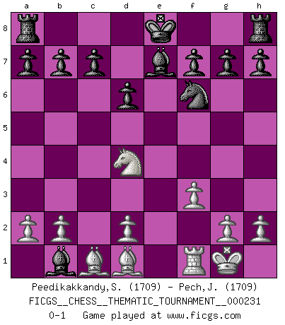 Last move : 0-1 2019 July 21 18:15:40 [Event "FICGS__CHESS__THEMATIC_TOURNAMENT__000231"] [Site "FICGS"] [Date "2019.03.02"] [Round "1"] [White "Peedikakkandy,Sameer"] [Black "Pech,Jaroslav"] [Result "0-1"] [WhiteElo "1709"] [BlackElo "1709"] 1.e4 e5 2.Nf3 Nf6 3.Nxe5 d6 4.Nd3 Nxe4 5.Qe2 Qe7 6.f3 Nf6 7.Qxe7+ Bxe7 8.Nc3 Nc6 9.Be2 Nd4 10.O-O Nxc2 11.Rb1 Nd4 12.Bd1 Bf5 13.Ne2 Bxd3 14.Nxd4 Bxb1 0-1 Petrov's defense Kingside Castling by player White (move 10) Player Black won this chess game. Follow this game move after move (download)There must have been a time when men were demigods, or they could not have invented Chess. (Gustav Schenk) Habe Mut, dich deines eigenen Verstandes zu bedienen. (Immanuel Kant) Coloca el contenido de las piezas del Ajedrez en un sombrero, agitalo vigorosamente, arrojalas en un tablero desde una altura de 30 centimetros y así obtendras el estilo de Steinitz. (H. E. Bird) Que feriez-vous si vous étiez en train de jouer aux échecs et que la fin du monde arrive ? Je continuerais à jouer. (Saint Borromée) Indecision is the key to flexibility. (Unknown)