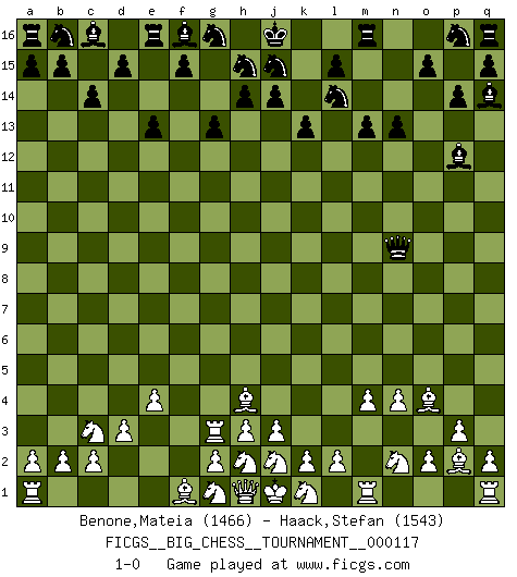 Last move : 1-0 2019 May 19 21:12:34 [Event "FICGS__BIG_CHESS__TOURNAMENT__000117"] [Site "FICGS"] [Date "2019.03.02"] [Round "1"] [White "Benone,Mateia"] [Black "Haack,Stefan"] [Result "1-0"] [WhiteElo "1466"] [BlackElo "1543"] 1.e2-e4 g15-g13 2.m2-m4 k15-k13 3.p2-p3 e15-e13 4.b1-c3 h16-f14 5.o1-p2 c15-c14 6.d2-d3 m15-m13 7.l1-o4 f14-f2 8.e1-e2 f2-n9 9.n2-n4 l16-p12 10.e2-e3 p15-p14 11.e3-g3 k16-l14 12.p1-n2 n15-n13 13.c1-g5 o16-q14 14.g5-h4 1-0 This big chess game has been lost on time (started : 2019.03.02 17:46:47) Follow this game move after move (download)If your opponent cannot do anything active, then don't rush the position; instead you should let him sit there, suffer, and beg you for a draw. (Jeremy Silman) Ich moechte nie einem Club beitreten, der Leute wie mich als Mitglieder aufnimmt. (Woody Allen) Preferería tener un Peón que un dedo. (Reuben Fine) Toutes les manuvres exécutées sur une colonne ouverte ont pour but ultime l'intrusion définitive sur la septième ou la huitième rangée, en plein cur de la position ennemie. (Aaron Nimzovitch) Bobby never cared about money, though. His only desire was to prove that his choices were correct: He wanted chess to be important because he was a chess player, and he wanted to be important. Bobby knew money was important, but he didn't have a clue why, outside of clothes and status. The only way he could accomplish what he wanted was to fight for a lot of money. Once he got it, he gave it away. He did not know how to spend it. And once he'd become champion, after, essentially, sacrificing his life for it, he didn't know how to spend his time. (Bob Wade)