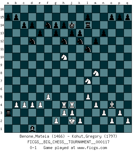 Last move : 0-1 2019 July 20 11:47:12 [Event "FICGS__BIG_CHESS__TOURNAMENT__000117"] [Site "FICGS"] [Date "2019.03.02"] [Round "1"] [White "Benone,Mateia"] [Black "Kohut,Gregory"] [Result "0-1"] [WhiteElo "1466"] [BlackElo "1797"] 1.e2-e4 j15-k13 2.j2-h4 p16-o14 3.b1-c3 b16-c14 4.d2-d3 m15-m13 5.c1-k8 e15-e13 6.m2-m4 h15-g13 7.l1-o4 f16-c13 8.p2-p3 l16-p12 9.o1-p2 d15-d14 10.p1-o3 c16-l8 11.l2-l4 n15-n14 12.k1-l3 e16-e14 13.o3-p5 o16-g9 14.l4-l5 a16-e16 15.p2-d13 e14-f14 16.f1-e2 l8-e2 17.c3-e2 g16-e15 18.d13-p2 k16-h15 19.h1-k3 h16-l13 20.k3-b11 c13-b14 21.e2-c3 m16-m14 22.n2-n3 m14-l14 23.f2-f4 h15-j13 24.g1-f3 j16-j15 25.j1-j2 n14-n13 26.d3-d4 m13-m12 27.f3-g5 p12-o13 28.c3-d5 l13-m13 29.e1-e3 m13-l13 30.g5-h7 g9-c13 31.a1-e1 o13-h7 32.f4-f5 h7-p14 33.e3-g3 j13-h15 34.e1-e3 c14-d12 35.b11-d11 c15-c14 36.m1-f1 l13-l11 37.d11-l11 l14-l11 38.k8-j9 l11-l14 39.q1-l1 e15-g14 40.h4-g6 d12-e14 41.h2-j4 o14-m13 42.d5-b6 k13-l11 43.b6-c8 c13-g9 44.g6-e7 q16-m16 45.g3-g8 b14-d12 46.e3-g3 m16-m14 47.g8-g9 d12-g9 48.g3-g9 g13-h11 49.g9-a9 h11-j9 50.a9-j9 e14-d12 51.f1-f4 g14-h12 52.f4-g4 g15-g13 53.l1-f1 j14-j13 54.c8-d10 l14-k14 55.d10-e12 f14-g14 56.p2-m5 k14-k9 57.j9-k9 l11-k9 58.j4-k6 m14-k14 59.e12-g11 k9-l11 60.m5-e12 j15-j14 61.e12-g14 f15-g14 62.l3-m5 h15-f14 63.e7-g8 k14-k11 64.g4-j4 d12-f13 65.g11-h9 k11-a11 66.a2-a3 f14-h13 67.k6-j8 f13-d12 68.j8-h10 k15-k13 69.f1-f4 h13-f14 70.h9-g11 a11-g11 71.f4-g4 g11-a11 72.p5-n6 e16-n16 73.n6-m8 n16-n14 74.g8-j9 n14-l14 75.j9-l10 p14-q13 76.g4-h4 q13-d1 77.c2-c4 a11-b11 78.b2-b4 b11-a11 79.m5-l7 a11-a3 80.l10-k12 m13-k12 0-1 This big chess game has been lost on time (started : 2019.03.02 17:46:47) Follow this game move after move (download)The beauty of a move lies not in its' appearance but in the thought behind it. (Siegbert Tarrasch) Wenn ich mich einlogge, glauben die Leute gewöhnlich nicht, dass ich es selbst bin und sie fangen an, mir dumme Fragen zu stellen. Und wenn sie es glauben, stellen sie wieder andere dumme Fragen. (Judith Polgar) En el tablero, la mentira e hipocresía no sobreviven mucho. (Emanuel Lasker) Les Echecs représentent une sphère d'idées créatrices basée sur la volonté des deux protagonistes. (Smyslov) It is not true that people stop pursuing dreams because they grow old, they grow old because they stop pursuing dreams. (Gabriel Garcia Marquez)