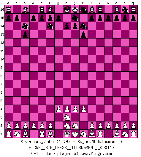 Last move : 0-1 2019 April 29 6:49:44 [Event "FICGS__BIG_CHESS__TOURNAMENT__000117"] [Site "FICGS"] [Date "2019.03.02"] [Round "1"] [White "Rivenburg,John"] [Black "Sujas,Abdulsamad"] [Result "0-1"] [WhiteElo "1179"] [BlackElo ""] 1.g2-g4 c15-c13 2.h3-h4 b16-c14 3.j3-j4 k15-k13 4.k2-k4 h15-k14 5.g1-h3 g16-f14 0-1 This big chess game has been lost on time (started : 2019.03.02 17:46:47) Follow this game move after move (download)On the chessboard, lies and hypocrisy do not survive long. (Emanuel Lasker) Wer mein Gambit spielt, muß bereit sein, alle Brücken hinter sich abzubrechen. Es verändert den ganzen Menschen. Es wirkt wie ein Zauberstab und fördert verkümmerte, gute Charakter- eigenschaften wieder zu Tage. (Emil Joseph Diemer) El Ajedrez hace al hombre ser mas sabio y ver mas claro. (Vladimir Putin) Je crois qu'il existe des manières très spécifiques de jouer efficacement contre une machine. Evidemment, nous n'avons aucune chance en technique pure, parce que l'ordinateur calcule de manière parfaite. Mais lorsque nous faisons appel à notre cerveau, en utilisant l'intuition et la compréhension, alors nous restons beaucoup plus forts. (Anatoli Karpov) The best teachers teach from the heart, not from the book. (Author unknown)