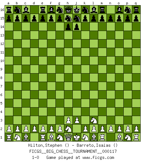 Last move : 1-0 2019 April 2 2:32:28 [Event "FICGS__BIG_CHESS__TOURNAMENT__000117"] [Site "FICGS"] [Date "2019.03.02"] [Round "1"] [White "Hilton,Stephen"] [Black "Barreto,Isaias"] [Result "1-0"] [WhiteElo ""] [BlackElo ""] 1.j2-l3 1-0 This big chess game has been lost on time (started : 2019.03.02 17:46:47) Follow this game move after move (download)You may learn much more from a game you lose than from a game you win. You will have to lose hundreds of games before becoming a good player. (Jose Raul Capablanca) Ich kenne Menschen, die allen Willen der Welt besitzen und doch nicht Schach spielen können. (Robert James Fischer) ¿Esta Bobby Fischer algo cuerdo?. (Salo Flohr) Comme les marins qui ont mille raisons différentes d'aller en mer, les joueurs d'échecs en ont tout autant avant de s'installer devant une table et jouer... (Vincent Bertignac, philosophe) Good decisions come from experience, and experience comes from bad decisions. (Anonymous)