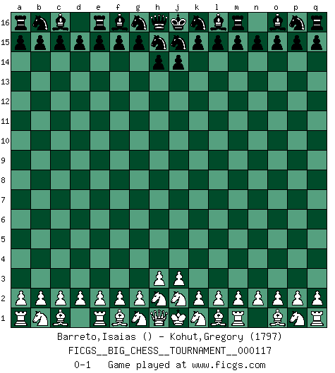Last move : 0-1 2019 April 2 2:32:28 [Event "FICGS__BIG_CHESS__TOURNAMENT__000117"] [Site "FICGS"] [Date "2019.03.02"] [Round "1"] [White "Barreto,Isaias"] [Black "Kohut,Gregory"] [Result "0-1"] [WhiteElo ""] [BlackElo "1797"] 0-1 This big chess game has been lost on time (started : 2019.03.02 17:46:47) Follow this game move after move (download)He who takes the Queen's Knight's Pawn will sleep in the streets. (Anonymous) Über Kasparov: Es ist offensichtlich, daß er in einem totalitären Staat aufwuchs und deshalb zu diktatorischen Zügen neigt. (Viktor Kortschnoi) La enorme capacidad mental, en la que sin ella no puede un jugador de Ajedrez existir, es demasiado requerida por el Ajedrez al grado de que nunca podrá liberar su mente de este juego. (Albert Einstein) Horreur, mais aussi harmonie suprême : qu'y avait-il en effet au monde en dehors des échecs ? Le brouillard, l'inconnu, le non-être... (Vladimir Nabokov) True nature is revealed in times of difficulty. (Chinese proverb)
