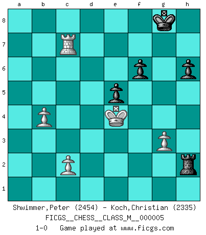 Last move : 1-0 2006 August 10 14:16:3 [Event "FICGS__CHESS__CLASS_M__000005"] [Site "FICGS"] [Date "2006.06.13"] [Round "1"] [White "Shwimmer,Peter"] [Black "Koch,Christian"] [Result "1-0"] [WhiteElo "2454"] [BlackElo "2335"] 1.e4 e5 2.Nf3 Nc6 3.Nc3 Nf6 4.Bb5 Bb4 5.O-O O-O 6.d3 d6 7.Bg5 Bxc3 8.bxc3 Bd7 9.Rb1 a6 10.Ba4 b5 11.Bb3 h6 12.Bh4 Na5 13.d4 Nxb3 14.axb3 Bc6 15.Re1 Re8 16.Qd3 a5 17.c4 b4 18.Qd2 Qe7 19.Ra1 Qd8 20.dxe5 dxe5 21.Qxd8 Raxd8 22.Bxf6 gxf6 23.Rxa5 Ra8 24.Rxa8 Rxa8 25.Kf1 Bd7 26.Re3 Ra1+ 27.Ne1 f5 28.Ke2 fxe4 29.Rxe4 f6 30.c5 Ra5 31.Nd3 Bf5 32.Rxb4 Bxd3+ 33.Kxd3 Rxc5 34.Rc4 Rd5+ 35.Ke4 Rd2 36.Rxc7 Rxf2 37.g3 Rxh2 38.b4 1-0 Four knights : Symmetrical variation Kingside Castling by player White (move 5) Kingside Castling by player Black (move 5) 10 pieces endgame at move 37 : White KRPPP , Black KRPPP WHITE : King + 1 Rook 3 Pawns BLACK : King + 1 Rook 3 Pawns Player White won this chess game. Follow this game move after move (download)Chess is so inspiring that I do not believe a good player is capable of having an evil thought during the game. (Wilhelm Steinitz) Kombinieren und Schwarzhandel gehören verboten. (Savielly Grigorievitsch Tartakower) Una compensación adecuada por un sacrificio es tener una combinación sólida que conduce a una posición ganadora; una compensación adecuada por una metida de pata es dejar a tu oponente arrebatar una derrota de las fauces de la victoria. (Bruce A. Moon) Un millionnaire : 'Monsieur Steinitz ! Vous ne participez aux tournois que pour l'argent, alors que moi je n'y viens que pour l'honneur.' Steinitz : 'Chacun joue pour ce qu'il n'a pas'... There are two kinds of people in the world, my friend. Those who have a loaded gun and those who dig. You dig ! (Blondie in The Good, The Bad and The Ugly)