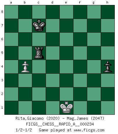 Last move : 1/2-1/2 2019 July 12 21:3:42 [Event "FICGS__CHESS__RAPID_A__000234"] [Site "FICGS"] [Date "2019.03.02"] [Round "1"] [White "Rita,Giacomo"] [Black "Mag,James"] [Result "1/2-1/2"] [WhiteElo "2020"] [BlackElo "2047"] 1.e4 c5 2.Nf3 d6 3.d4 cxd4 4.Nxd4 Nf6 5.Nc3 a6 6.Bg5 e6 7.f4 b5 8.e5 dxe5 9.fxe5 Qc7 10.exf6 Qe5+ 11.Be2 Qxg5 12.O-O Qe5 13.Nf3 Bc5+ 14.Kh1 Qxf6 15.Ne4 Qe7 16.Nfg5 f5 17.Bh5+ g6 18.Nxc5 Qxc5 19.Re1 Ra7 20.Nxe6 Bxe6 21.Rxe6+ Kf7 22.Qe1 Re7 23.Rxe7+ Qxe7 24.Qc3 Re8 25.Bf3 Qe5 26.Qxe5 Rxe5 27.Kg1 Rc5 28.c3 Nc6 29.Kf2 Ne5 30.Ke3 Nxf3 31.Kxf3 Ke6 32.a4 Kd5 33.axb5 axb5 34.Ra7 h6 35.h4 Rc4 36.Ra5 Rxh4 37.Rxb5+ Kc6 38.Rb8 h5 39.g3 Rh2 40.b4 g5 41.Rf8 Rc2 42.Rf6+ Kc7 43.Rxf5 Rxc3+ 44.Kf2 Rc2+ 45.Ke1 h4 46.gxh4 gxh4 47.Rc5+ Rxc5 1/2-1/2 Sicilian : Najdorf, Polugayevsky variation Kingside Castling by player White (move 12) 10 pieces endgame at move 37 : White KRPPP , Black KRPPP WHITE : King + 1 Rook 3 Pawns BLACK : King + 1 Rook 3 Pawns 9 pieces endgame at move 43 : White KRPPP , Black KRPP WHITE : King + 1 Rook 3 Pawns BLACK : King + 1 Rook 2 Pawns 8 pieces endgame at move 43 : White KRPP , Black KRPP WHITE : King + 1 Rook 2 Pawns BLACK : King + 1 Rook 2 Pawns 7 pieces endgame at move 46 : White KRPP , Black KRP WHITE : King + 1 Rook 2 Pawns BLACK : King + 1 Rook 1 Pawn 6 pieces endgame at move 46 : White KRP , Black KRP WHITE : King + 1 Rook 1 Pawn BLACK : King + 1 Rook 1 Pawn 5 pieces endgame at move 47 : White KP , Black KRP WHITE : King + 1 Pawn BLACK : King + 1 Rook 1 Pawn This chess game ended in a draw. Follow this game move after move (download)Nonsense was the last thing Fischer was interested in, as far as Chess was concerned. (Elie Agur) Was ist der Unterschied zwischen einem Strassenarbeiter und einem Schachspieler? --Der Schachspieler bewegt sich ab und zu. (Anonymous) El Ajedrez por encima de todo... ¡es una pelea!. (Emanuel Lasker) Un journaliste : 'Vous préférez avoir une dame de plus sur l'échiquier ou au lit ?' Boris Spassky : 'Ca dépend de la position.' God is an atheist. (Unknown)