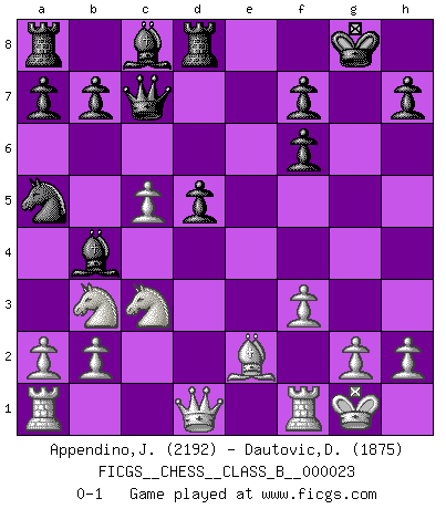 Last move : 0-1 2007 October 6 11:48:36 [Event "FICGS__CHESS__CLASS_B__000023"] [Site "FICGS"] [Date "2007.06.05"] [Round "1"] [White "Appendino,Jerome"] [Black "Dautovic,Dzenan"] [Result "0-1"] [WhiteElo "2192"] [BlackElo "1875"] 1.e4 c5 2.Nf3 Nc6 3.d4 cxd4 4.Nxd4 Nf6 5.f3 Qb6 6.Nb3 e6 7.c4 Bb4+ 8.Nc3 O-O 9.Bg5 Rd8 10.Be2 d5 11.exd5 exd5 12.c5 Qc7 13.Bxf6 gxf6 14.O-O Na5 0-1 This chess game has been lost on time (started : 2007.06.05 13:18:21) Sicilian defense Kingside Castling by player Black (move 8) Kingside Castling by player White (move 14) Player Black won this chess game. Follow this game move after move (download)My God, Bobby Fischer plays so simply. (Alexei Suetin) Offensichtlich kennt Kasparow nichts anderes als Schach, und ich könnte 500 weitere Spieler dieser Sorte benennen. (Judith Polgar) El Ajedrez es una guerra en un tablero. El objetivo es aplastar la mente del oponente. (Bobby Fischer) Les Echecs représentent une sphère d'idées créatrices basée sur la volonté des deux protagonistes. (Smyslov) Big Chess is a place for big hallucinations. (Thibault de Vassal)