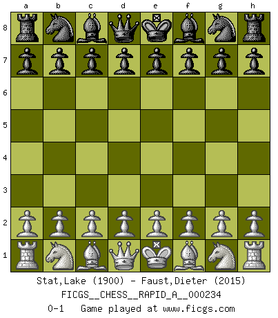 Last move : 0-1 2019 April 2 2:32:28 [Event "FICGS__CHESS__RAPID_A__000234"] [Site "FICGS"] [Date "2019.03.02"] [Round "1"] [White "Stat,Lake"] [Black "Faust,Dieter"] [Result "0-1"] [WhiteElo "1900"] [BlackElo "2015"] 0-1 This chess game has been lost on time (started : 2019.03.02 21:18:47) Player Black won this chess game. Follow this game move after move (download)I am still a victim of Chess. It has all the beauty of art and much more. It cannot be commercialized. Chess is much purer than art in its social position. (Marcel Duchamp) Wenn ich mich einlogge, glauben die Leute gewöhnlich nicht, dass ich es selbst bin und sie fangen an, mir dumme Fragen zu stellen. Und wenn sie es glauben, stellen sie wieder andere dumme Fragen. (Judith Polgar) Fischer deseaba darle a los Rusos una sopa de su propia medicina. (Larry Evans) Mon pion favori sur ma case favorite ! Bronstein en parlant d'un coup de pion en h5 quand il avait les Noirs. The Internet is so big, so powerful and pointless that for some people it is a complete substitute for life. (Andrew Brown)