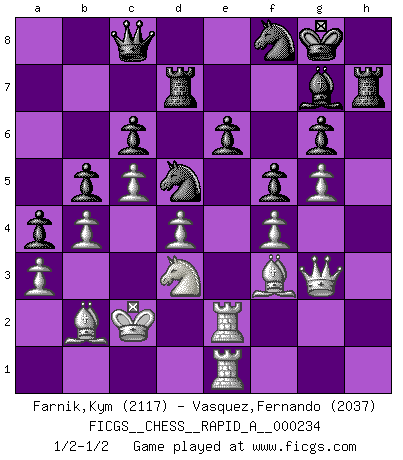Last move : 1/2-1/2 2019 May 27 3:0:18 [Event "FICGS__CHESS__RAPID_A__000234"] [Site "FICGS"] [Date "2019.03.02"] [Round "1"] [White "Farnik,Kym"] [Black "Vasquez,Fernando"] [Result "1/2-1/2"] [WhiteElo "2117"] [BlackElo "2037"] 1.Nf3 Nf6 2.g3 g6 3.Bg2 Bg7 4.d4 O-O 5.c4 c6 6.O-O d5 7.Nbd2 Bf5 8.b3 a5 9.Re1 a4 10.Ba3 Re8 11.Nh4 Be6 12.e3 Nbd7 13.Qc2 Qa5 14.b4 Qa6 15.c5 b5 16.h3 h5 17.f4 Qc8 18.Rf1 Nf8 19.Kh2 Bd7 20.e4 dxe4 21.Nxe4 Nd5 22.Rae1 Bf5 23.Nxf5 Qxf5 24.Qd2 Qd7 25.Ng5 Red8 26.Nf3 Qc7 27.Ne5 e6 28.Qe2 Qb7 29.g4 hxg4 30.hxg4 f6 31.Nd3 Rd7 32.Qf3 Rad8 33.Bb2 Qc7 34.a3 Bh6 35.Kh1 Rh7 36.Kg1 R8d7 37.Rf2 Rdf7 38.Kf1 Rh8 39.Ke2 f5 40.g5 Bg7 41.Qg3 Rh7 42.Kd2 Rd7 43.Rfe2 Qb7 44.Kc2 Qc8 45.Bf3 1/2-1/2 Reti : King's Indian attack Kingside Castling by player Black (move 4) Kingside Castling by player White (move 6) This chess game ended in a draw. Follow this game move after move (download)A passed Pawn increases in strength as the number of pieces on the board diminishes. (Capablanca) Dass jemand wie Surab Asmaiparaschwili, der selbst Elopunkte gekauft hat , Vize-Präsident der Fide werden konnte, sagt schon einges über den Zustand dieser Organisation aus. (Joel Lautier) El Ajedrez por encima de todo... ¡es una pelea!. (Emanuel Lasker) Roi des jeux et jeu des rois, les échecs portent en eux un sentiment d'infini. Ils donnent à celui qui s'est efforcé d'en approfondir les arcanes l'impression de n'être pas à la mesure de l'homme; en fait, ils constituent un résumé de l'univers, un microcosme, et figurent cette grande échelle qui, dans les plans de la lumière descend jusqu'à la matière, qui des abîmes insondables remonte jusqu'en l'infini de Dieu. (Pyrame) Remember : Your focus determines your reality. (Qui-Gon Jinn in Star Wars ep.1)