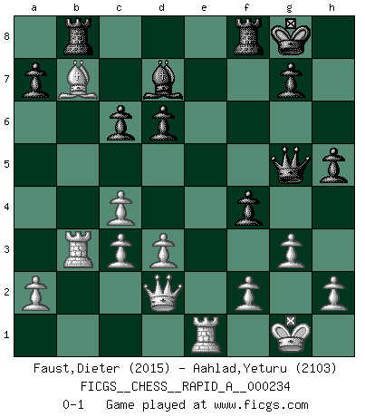 Last move : 0-1 2019 April 13 16:24:15 [Event "FICGS__CHESS__RAPID_A__000234"] [Site "FICGS"] [Date "2019.03.02"] [Round "1"] [White "Faust,Dieter"] [Black "Aahlad,Yeturu"] [Result "0-1"] [WhiteElo "2015"] [BlackElo "2103"] 1.c4 e5 2.Nc3 Nf6 3.g3 Bb4 4.Qc2 O-O 5.Bg2 Nc6 6.Nf3 Re8 7.O-O d6 8.d3 Bg4 9.Bg5 Bxc3 10.bxc3 h6 11.Bxf6 Qxf6 12.Nd2 Rab8 13.Rfe1 Bd7 14.Rab1 Nd8 15.e3 Ne6 16.Bxb7 c6 17.Ne4 Qe7 18.Rb2 f5 19.Nd2 f4 20.Ne4 Rf8 21.Rb3 h5 22.exf4 exf4 23.Qd2 Ng5 24.Nxg5 Qxg5 0-1 English : Bremen, Smyslov system Kingside Castling by player Black (move 4) Kingside Castling by player White (move 7) Player Black won this chess game. Follow this game move after move (download)First-class players lose to second class players because second-class players sometimes play a first-class game. (Tarrasch) Garry Kasparov war erst in der Großmeister-Organisation GMA, dann in der Profischach-Vereinigung PCA, zum Schluss kehrte er wieder in den Schoß der FIDE zurück. Aber gut, manche Leute sind flexibel (Viswanathan Anand) Repentinamente, me resultaba obvio en mi analisis que yo había pasado por alto lo que Fischer había visto en el tablero con la mas grande facilidad. (Mikhail Botvinnik) Les Echecs sont affaire de jugement sensible. Savoir quand frapper et quand esquiver. (Fischer) . 'gn is not allowed in chess unless n is an integer between 1 and 8 inclusive, where 1 and 8 are to interpreted as the standard numerals standing for integers in the ordered real-closed field R, with the *canonical* ordering. (As opposed to, say, an integer in the domain Z[2+i*sqrt(5)] or an integer in some exotic Grothendieck topos). (Normajean Yates)