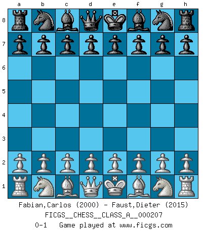 Last move : 0-1 2019 April 12 15:59:17 [Event "FICGS__CHESS__CLASS_A__000207"] [Site "FICGS"] [Date "2019.03.03"] [Round "1"] [White "Fabian,Carlos"] [Black "Faust,Dieter"] [Result "0-1"] [WhiteElo "2000"] [BlackElo "2015"] 0-1 This chess game has been lost on time (started : 2019.03.03 7:29:6) Player Black won this chess game. Follow this game move after move (download)Botvinnik tried to take the mystery out of Chess, always relating it to situations in ordinary life. He used to call Chess a typical inexact problem similar to those which people are always having to solve in everyday life. (Garry Kasparov) Über Karpov: Er war und ist ein Vertreter der russischen Reaktionäre. Das steckt tief in seiner Seele, wehalb ich nicht nett mit ihm umgehen kann. (Viktor Kortschnoi) Hoy en día, si tu no eres un Gran Maestro a los 14 años, es mejor que lo olvides. (Anand Viswanathan) Le pion, dans sa simplicité, marche droit devant lui, mais lorsqu'il prend, il le fait obliquement? Ainsi l'homme, tant qu'il reste pauvre, marche dans la droiture et vit honnêtement, mais lorsqu'il recherche les honneurs, il flatte, se parjure et, par les voies obliques, cherche une position supérieure sur l'échiquier du monde. (Jean de Galles) We're missing something. (Gregory House, House M.D.)