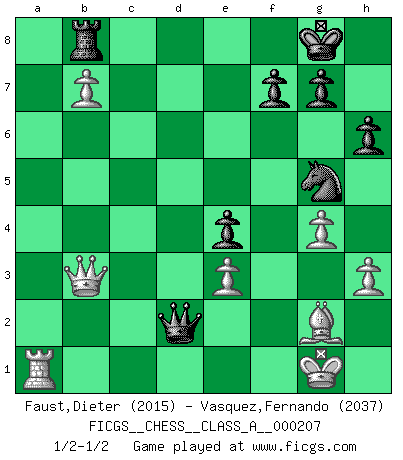 Last move : 1/2-1/2 2019 June 27 22:53:1 [Event "FICGS__CHESS__CLASS_A__000207"] [Site "FICGS"] [Date "2019.03.03"] [Round "1"] [White "Faust,Dieter"] [Black "Vasquez,Fernando"] [Result "1/2-1/2"] [WhiteElo "2015"] [BlackElo "2037"] 1.c4 e5 2.Nc3 Nf6 3.Nf3 Nc6 4.g3 Bb4 5.Bg2 O-O 6.O-O d6 7.d3 h6 8.Bd2 a5 9.a3 Bxc3 10.Bxc3 a4 11.Rc1 Re8 12.h3 Qe7 13.Nd2 Nh7 14.e3 Bf5 15.Ne4 Qd7 16.g4 Bxe4 17.Bxe4 Nf6 18.Bg2 d5 19.cxd5 Nxd5 20.b4 axb3 21.Qxb3 Nxc3 22.Qxc3 Ra6 23.Rb1 Nd8 24.Rb4 Rd6 25.Bxb7 Rxd3 26.Qc4 c5 27.Be4 Rxe3 28.fxe3 cxb4 29.axb4 Qd2 30.Qb3 Ne6 31.b5 Rd8 32.b6 Ng5 33.Bg2 e4 34.b7 Rb8 35.Ra1 1/2-1/2 English Opening Kingside Castling by player Black (move 5) Kingside Castling by player White (move 6) This chess game ended in a draw. Follow this game move after move (download)It began to feel as though you were playing against Chess itself. - On playing against Robert Fischer. (Walter Shipman) Mutter, ich bin eben Ex-Weltmeister geworden. --beim nach Hause Kommen nach dem Verlust des WM-Titels an Mihail Botvinnik -- (Mikhail Nekhemyevich Tal) No puedes jugar al Ajedrez si eres de corazón noble. (Proverbio Francés) Un footballeur joue avec ses pieds, parfois avec sa tête. Un joueur d'échecs ne joue qu'avec sa tête. Et quand il ne joue plus, il meurt. (Jacob Murray) First of all, we have to go back to the classical time control. (Anatoly Karpov)