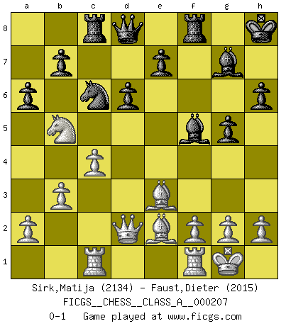 Last move : 0-1 2019 June 21 9:58:5 [Event "FICGS__CHESS__CLASS_A__000207"] [Site "FICGS"] [Date "2019.03.03"] [Round "1"] [White "Sirk,Matija"] [Black "Faust,Dieter"] [Result "0-1"] [WhiteElo "2134"] [BlackElo "2015"] 1.e4 c5 2.Nf3 Nc6 3.d4 cxd4 4.Nxd4 g6 5.c4 Bg7 6.Be3 d6 7.Nc3 Nh6 8.Be2 O-O 9.O-O f5 10.exf5 Nxf5 11.Nxf5 Bxf5 12.Rc1 Rc8 13.Qd5+ Kh8 14.b3 h6 15.Qd2 g5 16.Nb5 a6 0-1 Sicilian : Accelerated Fianchetto, Maroczy bind, 6.Be3 Kingside Castling by player Black (move 8) Kingside Castling by player White (move 9) Player Black won this chess game. Follow this game move after move (download)You have to have the fighting spirit. You have to force moves and take chances. (Bobby Fischer) Matt entspricht nicht immer den Tatsachen. (Savielly Grigorievitsch Tartakower) Las piezas de Ajedrez son los bloques del alfabeto que moldean los pensamientos; y esos pensamientos, aunque hagan un diseño visual en el tablero, expresan abstractamente su belleza como un poema. (Marcel Duchamp) Même si l'adversaire joue le coup analysé précédemment, recommencez l'analyse en voyant la nouvelle position. Première règle de Blumenfeld However beautiful the strategy, you should occasionally look at the results. (Winston Churchill)