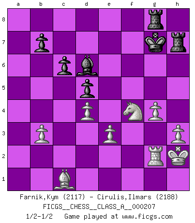 Last move : 1/2-1/2 2019 April 30 12:6:41 [Event "FICGS__CHESS__CLASS_A__000207"] [Site "FICGS"] [Date "2019.03.03"] [Round "1"] [White "Farnik,Kym"] [Black "Cirulis,Ilmars"] [Result "1/2-1/2"] [WhiteElo "2117"] [BlackElo "2188"] 1.d4 f5 2.g3 Nf6 3.Bg2 d5 4.c4 c6 5.Nh3 e6 6.O-O Bd6 7.Bf4 Be7 8.b3 h6 9.Nc3 g5 10.Bc1 O-O 11.Bb2 Nbd7 12.cxd5 exd5 13.f3 Qe8 14.e3 g4 15.Nf4 gxf3 16.Rxf3 Bd6 17.Qc1 Nh7 18.Nd1 Rf7 19.Ba3 Bb8 20.Rb1 Rg7 21.Rf1 h5 22.Nb2 Ndf6 23.Nbd3 Ng4 24.Re1 Ng5 25.Rb2 a5 26.Rc2 Bd7 27.R1e2 Ne4 28.Qe1 a4 29.Bc1 Bd6 30.Bb2 Qe7 31.Ne5 Be8 32.Nf3 Bb4 33.Qd1 axb3 34.axb3 Qf6 35.Nh4 Kh7 36.Kh1 Bf7 37.Bf3 Rag8 38.Bc1 Nc3 39.Rxc3 Bxc3 40.Rg2 Kh8 41.h3 Nh6 42.Kh2 Bb4 43.Bxh5 Bd6 44.Be2 Be6 45.Bd3 Bc8 46.Qc2 Rh7 47.Qa2 Re8 48.Qc2 Rg8 49.Qa2 Bc7 50.Qc2 Nf7 51.Bxf5 Bxf5 52.Qxf5 Qxf5 53.Nxf5 Nd6 54.Nxd6 Bxd6 55.g4 Kg7 1/2-1/2 Dutch defense Kingside Castling by player White (move 6) Kingside Castling by player Black (move 10) This chess game ended in a draw. Follow this game move after move (download)Good positions don't win games, good moves do. (Gerald Abrahams) Wie ich sie so einen nach dem anderen nieder mähte wurde meine Überlegenheit offensichtlich. (José Raúl Capablanca) Algunos sacrificios son sólidos, los demás son míos. (Mikhail Tal) On a dit que l'homme se distingue de l'animal par le fait qu'il achète plus de livres qu'il ne peut en lire. Je voudrais suggérer qu'inclure à la liste des livres quelques livres d'échecs rendrait la distinction manifeste. (Edward Lasker) The obstacle is the path. (Zen proverb)