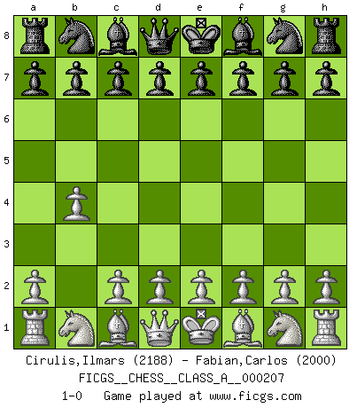 Last move : 1-0 2019 April 12 15:59:17 [Event "FICGS__CHESS__CLASS_A__000207"] [Site "FICGS"] [Date "2019.03.03"] [Round "1"] [White "Cirulis,Ilmars"] [Black "Fabian,Carlos"] [Result "1-0"] [WhiteElo "2188"] [BlackElo "2000"] 1.b4 1-0 This chess game has been lost on time (started : 2019.03.03 7:29:6) Polish (Sokolsky) opening Player White won this chess game. Follow this game move after move (download)My style is somewhere between that of Tal and Petrosian. (Reshevsky) Die Partien sind immer verschieden, die Interviews immer die gleichen. (Garry Kasparov) Me siento como si fuera una pieza en una partida de Ajedrez, cuando mi oponente me indica: esa pieza no puede ser movida. (Soren Kierkegaard) Mon pion favori sur ma case favorite ! Bronstein en parlant d'un coup de pion en h5 quand il avait les Noirs. You can think I'm wrong, but that's no reason to quit thinking. (Gregory House, House M.D.)