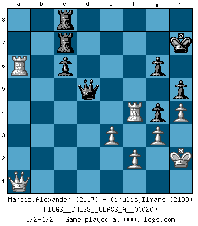Last move : 1/2-1/2 2019 May 8 8:51:30 [Event "FICGS__CHESS__CLASS_A__000207"] [Site "FICGS"] [Date "2019.03.03"] [Round "1"] [White "Marciz,Alexander"] [Black "Cirulis,Ilmars"] [Result "1/2-1/2"] [WhiteElo "2117"] [BlackElo "2188"] 1.d4 f5 2.g3 Nf6 3.Bg2 d5 4.Nf3 e6 5.c4 c6 6.O-O Nbd7 7.Ng5 Nb6 8.Nd2 dxc4 9.e3 Be7 10.Ngf3 O-O 11.a4 a5 12.Qc2 Bd6 13.Nxc4 Nxc4 14.Qxc4 Qe7 15.Ne5 Rd8 16.Qc2 Bd7 17.Nxd7 Rxd7 18.Bd2 Bb4 19.Bc3 Bd6 20.Rab1 Qf7 21.b4 Bxb4 22.Bxb4 axb4 23.Rxb4 Qe7 24.Rfb1 Ra7 25.Rc4 h6 26.Rc5 Rd8 27.Qb3 Kh7 28.h4 Rda8 29.Re5 Re8 30.Bh3 g6 31.Rc5 Qd8 32.Bg2 Re7 33.Re1 Qd6 34.Rec1 Nd7 35.R5c4 Nf6 36.Qb6 Ra8 37.Qb1 Ra7 38.R1c2 h5 39.Bf3 e5 40.dxe5 Qxe5 41.Kg2 Rc7 42.Re2 Rd7 43.Rb4 Rf7 44.Rf4 Re7 45.Qb6 Ra6 46.Qb3 Ra7 47.Kg1 Kg7 48.Rb4 Kh7 49.Rd2 Qe6 50.Qb1 Rg7 51.Rbd4 Qe5 52.Qb3 Ra8 53.Kg2 Qe7 54.Qb1 Qc7 55.Rb4 Ra7 56.Rdb2 Qd7 57.Qc1 Qe7 58.R2b3 Rf7 59.a5 Ng4 60.Qb2 Ne5 61.Be2 Qc7 62.Rb6 Re7 63.R3b4 Ng4 64.Qb1 Qd7 65.Qa2 Qd6 66.Qb2 Qc7 67.Qb1 Qd7 68.Bxg4 fxg4 69.R4b5 Kh6 70.Rg5 Qe6 71.Kg1 Qf6 72.Rb4 Ra8 73.Rf4 Qg7 74.Qd3 Rae8 75.a6 bxa6 76.Qc4 Rc7 77.Ra5 Rd8 78.Rxa6 Qe5 79.Kh2 Rdc8 80.Qc2 Kh7 81.Qa4 Qg7 82.Qb3 Qg8 83.Qb4 Qg7 84.Qc4 Qe5 85.Qa2 Qd5 86.Qa1 1/2-1/2 Dutch defense Kingside Castling by player White (move 6) Kingside Castling by player Black (move 10) This chess game ended in a draw. Follow this game move after move (download)Everything is in a state of flux, and this includes the world of Chess. (Mikhail Botvinnik) Die starken Figuren des Gegners muss man abtauschen. (José Raúl Capablanca) Ciertamente el estado mental actual de Bobby Fischer es una tragedia. Uno de los mas grandes jugadores de Ajedrez del mundo -el orgullo y pena del Ajedrez Americano. (Frank Brady) Dieu déplace le joueur, et celui-ci la pièce. Quel Dieu derrière Dieu commence donc la trame ? Arturo Perez-Reverte (prix de littérature policière 1993). Only sick music makes money today. (Friedrich Nietzsche)