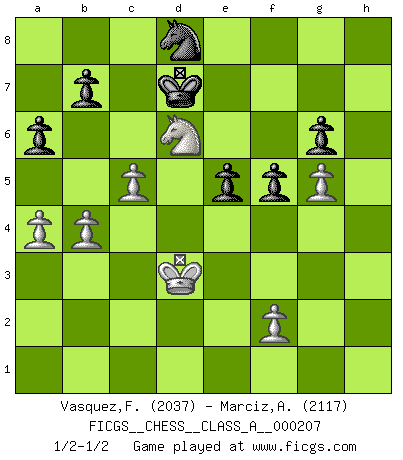 Last move : 1/2-1/2 2019 June 4 4:29:43 [Event "FICGS__CHESS__CLASS_A__000207"] [Site "FICGS"] [Date "2019.03.03"] [Round "1"] [White "Vasquez,Fernando"] [Black "Marciz,Alexander"] [Result "1/2-1/2"] [WhiteElo "2037"] [BlackElo "2117"] 1.e4 c5 2.c3 Nf6 3.e5 Nd5 4.Nf3 Nc6 5.Bc4 Nb6 6.Bb3 c4 7.Bc2 d5 8.exd6 e5 9.O-O Bxd6 10.d3 cxd3 11.Qxd3 Be6 12.Rd1 Be7 13.Qe2 Qc7 14.Ng5 Bxg5 15.Bxg5 f6 16.Be3 Nd5 17.Na3 a6 18.Bb3 Rd8 19.Bc5 Nce7 20.Bxe7 Kxe7 21.Qf3 Nf4 22.Bxe6 Kxe6 23.Nc2 f5 24.g3 Nh3+ 25.Kg2 Ng5 26.Qe2 g6 27.h4 Nf7 28.c4 Rxd1 29.Rxd1 Rd8 30.Rxd8 Nxd8 31.Ne3 Nc6 32.c5 Qd8 33.Qc4+ Kf6 34.Qb3 Qb8 35.g4 Qc8 36.g5+ Kg7 37.Nc4 Nd4 38.Qb6 Qc6+ 39.Qxc6 Nxc6 40.Nd6 Nd8 41.Kf3 Kf8 42.b4 Ke7 43.Ke3 Ke6 44.Ne8 Kf7 45.Nd6+ Kf8 46.a4 Ke7 47.h5 Kd7 48.hxg6 hxg6 49.Kd3 1/2-1/2 Sicilian : Alapin's variation (2.c3) Kingside Castling by player White (move 9) This chess game ended in a draw. Follow this game move after move (download)I played Chess with him and would have beaten him sometimes only he always took back his last move, and ran the game out differently. (Mark Twain) Im Reiche der Wirklichkeit ist man nie so glücklich wie im Reiche der Gedanken. (Arthur Schopenhauer) Hoy en día, si tu no eres un Gran Maestro a los 14 años, es mejor que lo olvides. (Anand Viswanathan) Le thème de l'attaque double intervient d'une manière ou d'une autre dans l'immense majorité des combinaisons. (Youri Averbakh) When you stop learning you start dying. (M. Scott Adams)