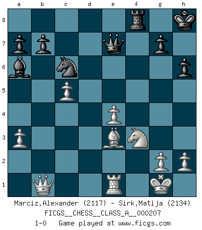 Last move : 1-0 2019 June 21 9:57:53 [Event "FICGS__CHESS__CLASS_A__000207"] [Site "FICGS"] [Date "2019.03.03"] [Round "1"] [White "Marciz,Alexander"] [Black "Sirk,Matija"] [Result "1-0"] [WhiteElo "2117"] [BlackElo "2134"] 1.d4 Nf6 2.c4 e6 3.Nc3 Bb4 4.f3 d5 5.a3 Bxc3+ 6.bxc3 c5 7.cxd5 Nxd5 8.dxc5 f5 9.Nh3 Qa5 10.e4 fxe4 11.fxe4 Nf6 12.Be2 Qxc3+ 13.Bd2 Qd4 14.Rc1 Nc6 15.Rc4 Qd7 16.O-O O-O 17.Rc3 Qe7 18.Be3 Bd7 19.Qb1 Be8 20.Ng5 Bh5 21.Bc4 Ng4 22.Bxe6+ Kh8 23.Bxg4 Bxg4 24.Nf3 Rae8 25.Nd2 Be2 26.Rxf8+ Rxf8 27.Rc1 h6 28.Re1 Ba6 29.Nf3 1-0 Nimzo-Indian : Kmoch variation Kingside Castling by player White (move 16) Kingside Castling by player Black (move 16) Player White won this chess game. Follow this game move after move (download)Chess is ruthless: you've got to be prepared to kill people. (Nigel Short) Das typische an einem Großmeister ist, daß er eine gewonnene Position schnell und schmerzlos gewinnt. (Irving Chernev) No es una movida, aún la mejor movida que tu debas buscar, sino un plan comprensible. (Eugene Znosko-Borovsky) Le moment que je préfère le plus dans une rencontre, c'est celui où je sens que la personnalité de l'adversaire se brise. (Robert Fischer) Experiences are the keys to life. (Daniel Parmet)