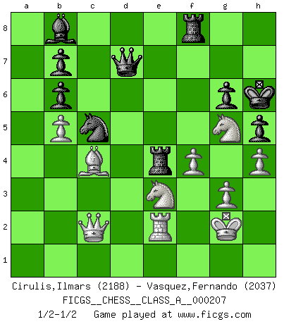 Last move : 1/2-1/2 2019 June 20 3:45:36 [Event "FICGS__CHESS__CLASS_A__000207"] [Site "FICGS"] [Date "2019.03.03"] [Round "1"] [White "Cirulis,Ilmars"] [Black "Vasquez,Fernando"] [Result "1/2-1/2"] [WhiteElo "2188"] [BlackElo "2037"] 1.b4 e5 2.a3 d5 3.Bb2 Nd7 4.e3 Ngf6 5.c4 a5 6.b5 Bd6 7.cxd5 Nxd5 8.d3 O-O 9.Nf3 Qe7 10.Be2 Nc5 11.Nbd2 Bd7 12.d4 exd4 13.Nxd4 Nb6 14.a4 Qg5 15.O-O Bh3 16.Bf3 Qe5 17.g3 Bxf1 18.Kxf1 g6 19.Qc2 Qe7 20.h4 Rab8 21.Kg2 h5 22.Bc3 Rfe8 23.Bxa5 Ra8 24.Bxb6 cxb6 25.Nc4 Bc7 26.Bd5 Kg7 27.Nf3 Rad8 28.Rd1 Rd7 29.Rd2 Ra8 30.e4 Rxa4 31.e5 Ra8 32.Ng5 Rf8 33.f4 Qd8 34.Ne3 f6 35.exf6+ Qxf6 36.Re2 Kh6 37.Qc4 Qg7 38.Be6 Rd4 39.Qc2 Bb8 40.Bc4 Qd7 41.Nf3 Re4 42.Ng5 1/2-1/2 Polish (Sokolsky) opening Kingside Castling by player Black (move 8) Kingside Castling by player White (move 15) This chess game ended in a draw. Follow this game move after move (download)It was clear to me that the vulnerable point of the American Grandmaster (Bobby Fischer) was in double-edged, hanging, irrational positions, where he often failed to find a win even in a won position. (Efim Geller) Ich trinke, ich rauche, ich spiele, ich liebe Frauen aber Fernschach ist ein Laster, das ich nicht habe. (Mikhail Nekhemyevich Tal) Coloca el contenido del tablero de Ajedrez en un sombrero, agita las piezas vigorosamente, derrámalas en el tablero desde una altura de medio metro y así obtienes el estilo de Wilhelm Steinitz. (H. E. Bird) Les échecs c'est le défi de l'alpiniste, toujours plus haut, prêt à tout pour monter à l'assaut du Roi ennemi. Les échecs, c'est de la musique en mouvement, un ballet majestueux pour les yeux. C'est de la poésie composée par les fantômes du passé qui au même titre que Rimbaud ou Verlaine méritent notre admiration. Les échecs, c'est de la peinture ou le moindre mouvement modifie le tableau pour en faire un Picasso ou un Van Gogh. Les échecs, c'est tout et rien, c'est la vie et la mort. Jjulie33 sur le forum de France-Echecs. When you don't know what to do, walk fast and look worried. (Anonymous)