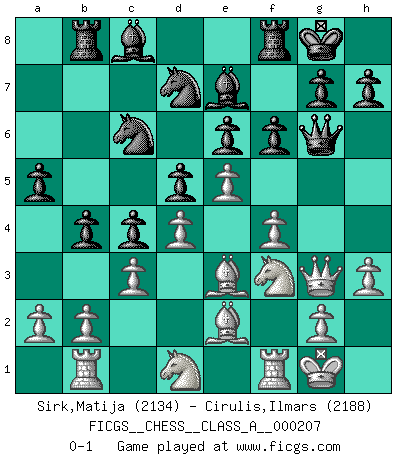 Last move : 0-1 2019 June 21 9:57:48 [Event "FICGS__CHESS__CLASS_A__000207"] [Site "FICGS"] [Date "2019.03.03"] [Round "1"] [White "Sirk,Matija"] [Black "Cirulis,Ilmars"] [Result "0-1"] [WhiteElo "2134"] [BlackElo "2188"] 1.e4 e6 2.d4 d5 3.Nc3 Nf6 4.e5 Nfd7 5.f4 c5 6.Nf3 Nc6 7.Be3 Be7 8.Qd2 a6 9.Be2 b5 10.Nd1 O-O 11.O-O b4 12.c3 a5 13.Rc1 c4 14.Rb1 Rb8 15.h3 f6 16.Qe1 Qe8 17.Qg3 Qg6 0-1 French : Steinitz, Boleslavsky variation Kingside Castling by player Black (move 10) Kingside Castling by player White (move 11) Player Black won this chess game. Follow this game move after move (download)That's what Chess is all about. One day you give your opponent a lesson, the next day he gives you one. (Bobby Fischer) Die Fehler sind da, Sie warten nur darauf gemacht zu werden. (Savielly Grigorievitsch Tartakower) El Ajedrez es parte de la cultura, y si una cultura esta en decadencia, entonces también el Ajedrez declinará. (Mikhail Botvinnik) C'est la seule position que je connaisse où les deux camps sont mals. Propos prêtés à V. Anand. A good teacher is like a candle - it consumes itself to light the way for others. (Author unknown)