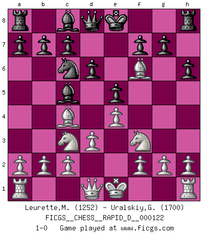 Last move : 1-0 2019 April 10 3:51:34 [Event "FICGS__CHESS__RAPID_D__000122"] [Site "FICGS"] [Date "2019.03.04"] [Round "1"] [White "Leurette,Marc-Antoine"] [Black "Uralskiy,Georgiy"] [Result "1-0"] [WhiteElo "1252"] [BlackElo "1700"] 1.e4 e5 2.Nf3 Nf6 3.Nc3 Nc6 4.Bc4 Bc5 5.d3 d6 6.Bg5 h6 7.Bxf6 1-0 This chess game has been lost on time (started : 2019.03.04 14:47:55) Petrov Three knights game Player White won this chess game. Follow this game move after move (download)Do you realize Fischer almost never has any bad pieces? He exchanges them, and the bad pieces remain with his opponents. (Yuri Balashov) Ich war zu klein für die Schach-Schülermannschaft! (Woody Allen) Yo creo que el Ajedrez posee una magia que es también una ayuda en la edad avanzada. Una rodilla reumática es olvidada durante una partida de Ajedrez y otros eventos pueden parecer algo sin importancia comparada a una catástrofe en el tablero de Ajedrez. (Vlastimil Hort) On n'a jamais que l'âge auquel on a commence à jouer aux échecs car après on cesse de vieillir. (Capablanca) Nowadays, anyone who cannot speak English and is incapable of using the Internet is regarded as backward. (Al-Waleed bin Talal)