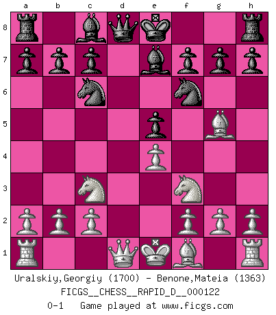 Last move : 0-1 2019 April 30 6:50:26 [Event "FICGS__CHESS__RAPID_D__000122"] [Site "FICGS"] [Date "2019.03.04"] [Round "1"] [White "Uralskiy,Georgiy"] [Black "Benone,Mateia"] [Result "0-1"] [WhiteElo "1700"] [BlackElo "1363"] 1.e4 d6 2.d4 Nf6 3.Nc3 e5 4.dxe5 dxe5 5.Nf3 Nc6 6.Bg5 Be7 0-1 This chess game has been lost on time (started : 2019.03.04 14:47:55) Pirc defense Player Black won this chess game. Follow this game move after move (download)Fischer is the strongest player in the world. In fact, the strongest player who ever lived. (Larry Evans) Im Reiche der Wirklichkeit ist man nie so glücklich wie im Reiche der Gedanken. (Arthur Schopenhauer) Siempre es mejor sacrificar los hombres de tu oponente. (Savielly Tartakower) La vérité est comme le meilleur coup aux échecs : elle existe, mais il faut la chercher. (Arturo Perez-Reverte) I can't decide which is riskier; taking crazy risks, or taking advice on crazy risks from a crazy risk taker. (Gregory House in House M.D.)
