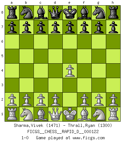 Last move : 1-0 2019 April 4 15:6:46 [Event "FICGS__CHESS__RAPID_D__000122"] [Site "FICGS"] [Date "2019.03.04"] [Round "1"] [White "Sharma,Vivek"] [Black "Thrall,Ryan"] [Result "1-0"] [WhiteElo "1471"] [BlackElo "1300"] 1.e4 1-0 This chess game has been lost on time (started : 2019.03.04 14:47:55) King's pawn Opening Player White won this chess game. Follow this game move after move (download)First-class players lose to second-class players because second-class players sometimes play a first-class game. (Siegbert Tarrasch) Der Traum, für den ich lebe, ist der von einem freien Russland. Viele mögen sagen: Russland hat doch ein Parlament, einen gewählten Präsidenten. Aber ich spüre, dass in meiner Heimat die Angst wiederkehrt. Eine Angst, sich frei zu äußern, bestimmte Dinge zu tun (Garry Kasparov) Todos los jugadores de Ajedrez deberían tener un pasatiempo. (Savielly Tartakower) Les Echecs mettent en conflit, non pas deux intelligences, mais deux volontés. (Lasker) Home computers are being called upon to perform many new functions, including the consumption of homework formerly eaten by the dog. (Doug Larson)