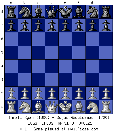 Last move : 0-1 2019 April 4 3:3:16 [Event "FICGS__CHESS__RAPID_D__000122"] [Site "FICGS"] [Date "2019.03.04"] [Round "1"] [White "Thrall,Ryan"] [Black "Sujas,Abdulsamad"] [Result "0-1"] [WhiteElo "1300"] [BlackElo "1700"] 0-1 This chess game has been lost on time (started : 2019.03.04 14:47:55) Player Black won this chess game. Follow this game move after move (download)The hardest game to win is a won game. (Emanuel Lasker) Karpov ist ein Museumsstück. (Garry Kasparov) Una compensación adecuada por un sacrificio es tener una combinación sólida que conduce a una posición ganadora; una compensación adecuada por una metida de pata es dejar a tu oponente arrebatar una derrota de las fauces de la victoria. (Bruce A. Moon) Aux échecs, l'amour-propre est satisfait quand on remporte la victoire, mais il n'y a pas de honte à être battu. (Benjamin Franklin) The modern world has divided itself into Conservatives and Progressives. The business of Progressives is to go on making mistakes. The business of the Conservatives is to prevent the mistakes from being corrected. (G.K. Chesterton)