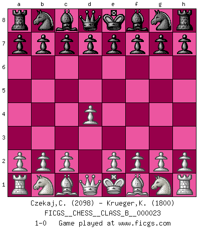 Last move : 1-0 2007 July 15 17:3:32 [Event "FICGS__CHESS__CLASS_B__000023"] [Site "FICGS"] [Date "2007.06.05"] [Round "1"] [White "Czekaj,Christophe"] [Black "Krueger,Karsten"] [Result "1-0"] [WhiteElo "2098"] [BlackElo "1800"] 1.d4 1-0 This chess game has been lost on time (started : 2007.06.05 13:18:21) Queen's pawn Player White won this chess game. Follow this game move after move (download)Bobby just drops the pieces and they fall on the right squares. (Miguel Najdorf) Der Schachmeister von Heute braucht Courage, einen Killerinstinkt, Ausdauer und Arroganz. (Larry Evans) Repentinamente, me resultaba obvio en mi analisis que yo había pasado por alto lo que Fischer había visto en el tablero con la mas grande facilidad. (Mikhail Botvinnik) Les Echecs mettent en conflit, non pas deux intelligences, mais deux volontés. (Lasker) Life is like a game of cards: the hand you are dealt represents determinism; the way you play it is free will. (Jawaharlal Nehru)